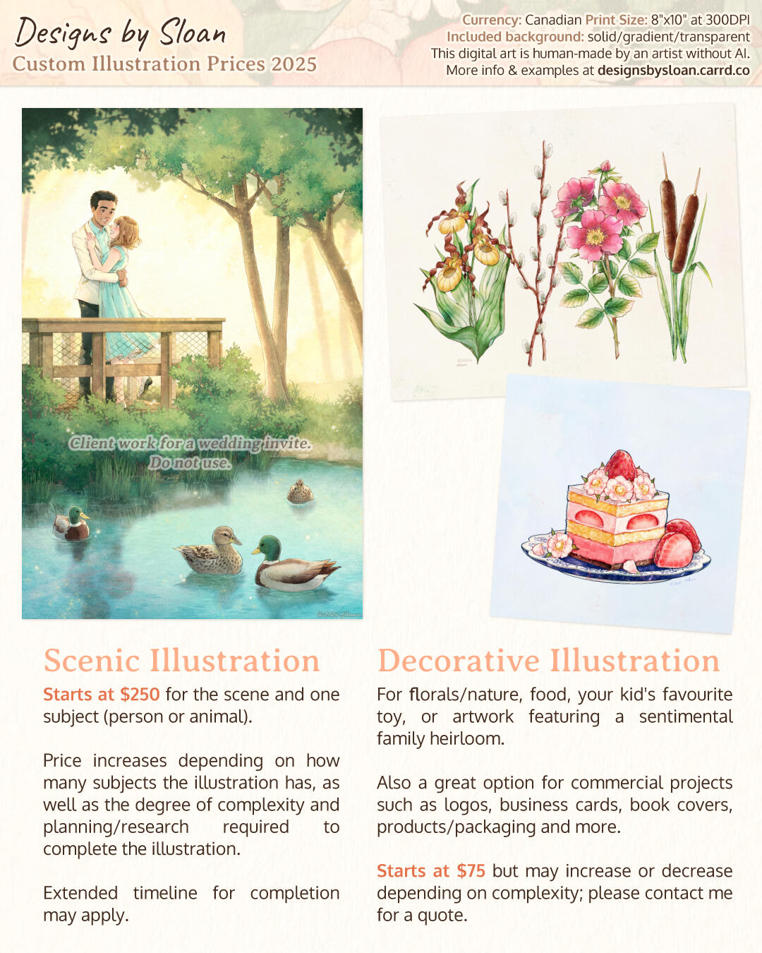 Additional fees may apply to: Rush deadlines, revisions/major changes, illustrations larger than 8.5"x11", complex details and additional subjects, commercial usage licensesPolicies Page: Please read my policies here for my refund/cancellation policy, personal and commercial licenses, usage terms and revisions/edits.By commissioning me, you are agreeing to and must abide by these terms.